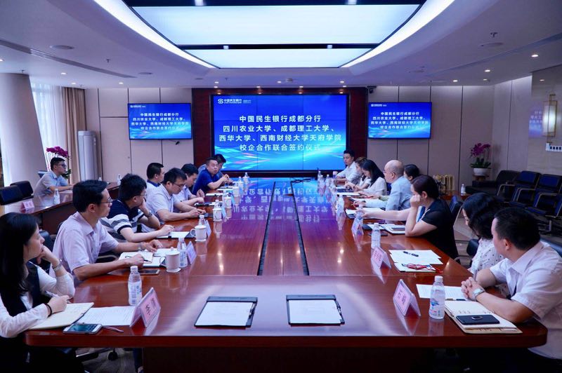 6月29日下午,beat365官方网站副书记何仁辉、经济系副系主任郑勇、办公室主任姚霞一行赴民生银行成都分行开展交流合作,与该行签订了教学实践基地协议,民生银行唐立斌副行长及人力资源部、团委等多个部门负责人出席了座谈会。