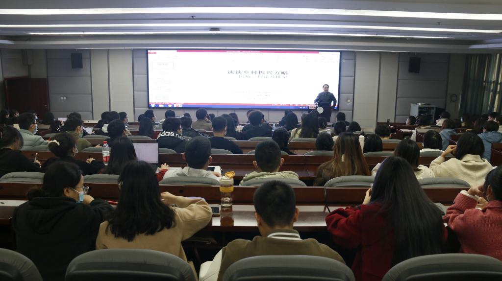 彭克强教授围绕乡村振兴研究背景与价值、乡村振兴发展面临的困境、乡村振兴研究的理论依据以及乡村振兴方略的基本框架四个方面阐述了当前乡村振兴发展的难题。以乡村振兴的四个研究背景——中华复兴冲刺与乡村振兴战略;改开历史经验与经济增长方式;新型发展格局与城乡融合发展和中国最大国情与农民组织起来为切入点,结合乡村振兴发展需要深入思考的若干问题以及面临的困境,从政治经济学、西方经济学、中国特色社会主义理论体系、习近平新时代中国特色社会主义思想等多理论依据,对乡村振兴方略的基本框架进行深入分析。报告受到广大师生热烈欢迎和广泛认同。