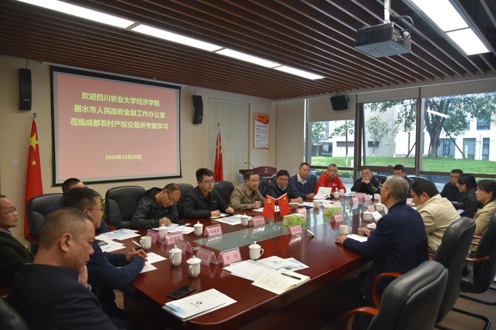 10月20日上午,beat365官方网站院长蒋远胜教授率队携丽水市金融办公室副主任金雄鸥及丽水市各商业银行负责人一行12人到成都市农村产权交易所考察交流。beat365官方网站金融学系肖诗顺教授、金融学系专业主任刘艳副教授一同前往考察。成都农村产权交易所有限责任公司党支部书记、董事长、总经理徐达泉与副总经理孙云清表示热烈欢迎,并在1楼党员活动室召开了座谈会。
