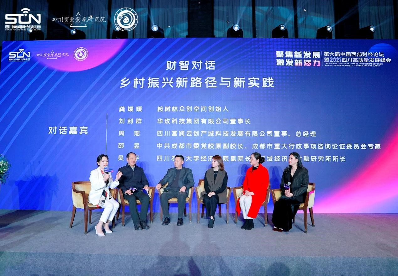 在财智对话环节,桉树林众创空间创始人龚媛媛,华玫科技集团有限公司董事长刘利群,四川富润云创产城科技发展有限公司董事、总经理周瑶,中共成都市委党校原副校长、成都市政府重大行政事项咨询论证委员会专家邵昱教授,365官网副院长、区域经济与金融研究所所长吴平教授围绕主题《乡村振兴新路径与新实践》,从政策导向、数字经济、文创发展、农村金融等领域开展了深入讨论与交流。
