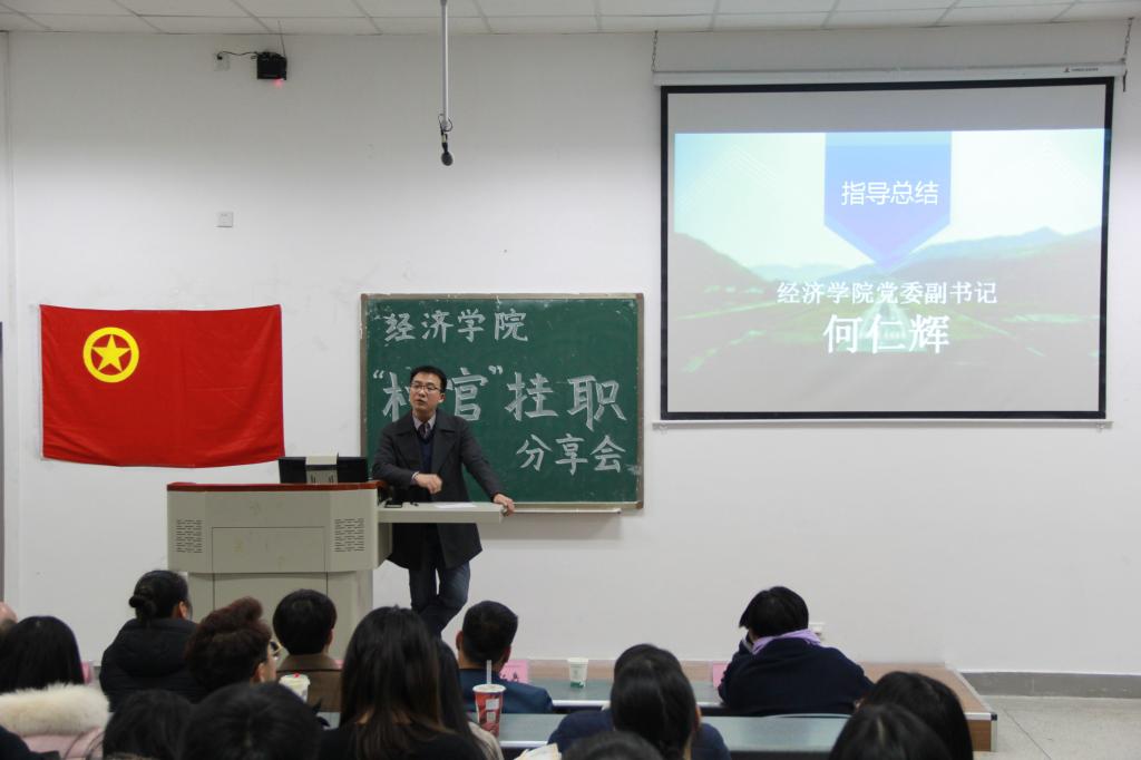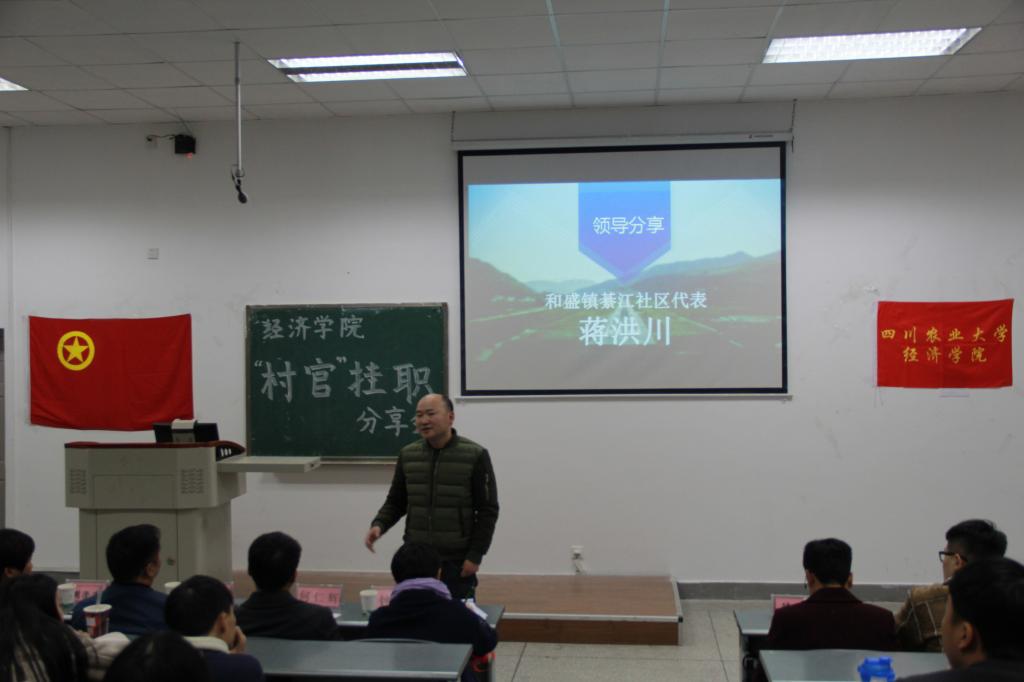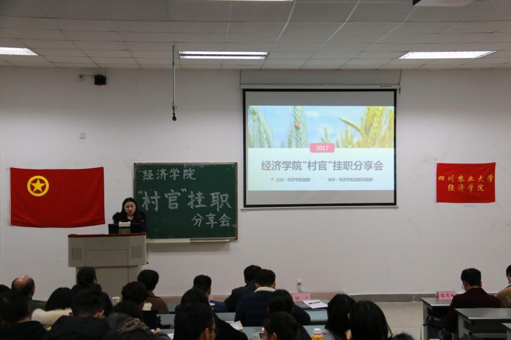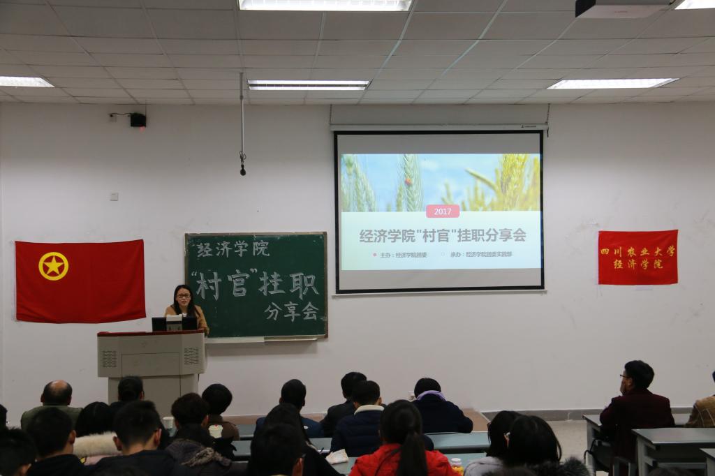 为展示2017年暑期“村官”挂职社会实践活动成果,并促进经院学子对“村官”挂职暑期社会实践活动的进一步了解。12月5日晚上19:00,由beat365官方网站团委主办,beat365官方网站团委实践部承办的暑期社会实践“村官”挂职分享交流会在第四教学楼A108举行,本次分享会365官网邀请温江区公平街道惠民社区党委书记官蓉,温江区公平街道惠民社区党委副书记张杰,温江区万春镇洪桥区村主任周澄清,温江区合盛镇铁篱村村主任何仁斌,温江区合盛镇綦江社区蒋洪川等嘉宾来参加。学院党委副书记何仁辉,学院团委书记钟贝也参加了该分享会。