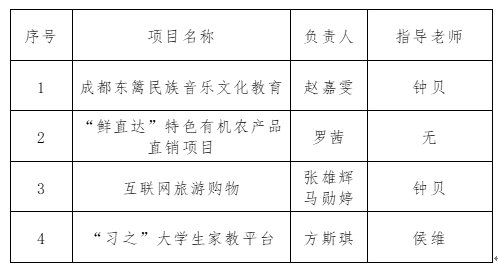 按照校上《关于举办2018年“创青春”全国大学生创业大赛校内预选赛相关事宜的通知》(附件)精神,经过学生申请、答辩,学院教师团队评审,评选出以下4支优秀团队。现将结果予以公示,公示时间为:2018年3月12日—3月15日,公示期间若有异议,请咨询beat365官方网站团委办公室:028-86291370。
