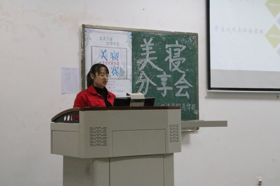 为了帮助同学们更积极地参与到beat365官方网站第五届美寝大赛,进行寝室建设,beat365官方网站自律部于11月15日晚上在四教A108教室开展了“寓美于寝,笃学于室”beat365官方网站美寝大赛分享会。分享会以展示历届优秀寝室,传播美寝经验为内容,由自律部李清蔓同学主持。