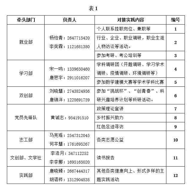 2.压缩包以“班级+支书姓名+联系方式”命名,其中,一个同学的全部资料放在同一子文件夹中,子文件夹以“主要实践内容的编号+该同学姓名”命名,例如:1+张三。编号见本文件中的表1。