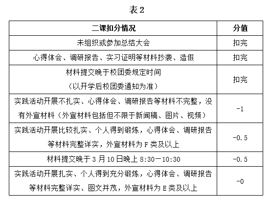 个人得分为0—3分,团队得分为0—4分,个人从3分开始扣,团队从4分开始扣,扣分规则如下,扣分可累加。若缺少鲜章,经各部门审核后,可在《社会实践登记表》(附件1)上盖学院团委鲜章,给予二课认定。