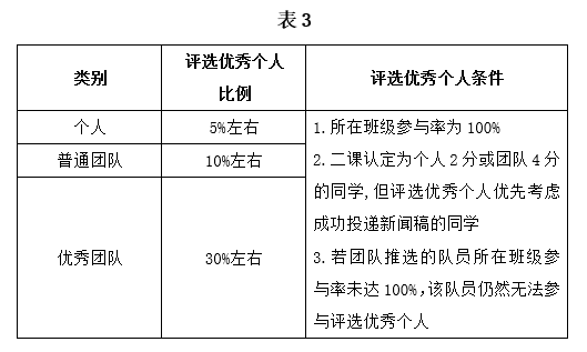 团队二课得分为4分的团队方可参评优秀团队评选,根据答辩情况(60分)、外宣情况(20分)和实践基地签署情况(20分)进行打分,按照得分进行评选。(答辩时间、方式另行通知)