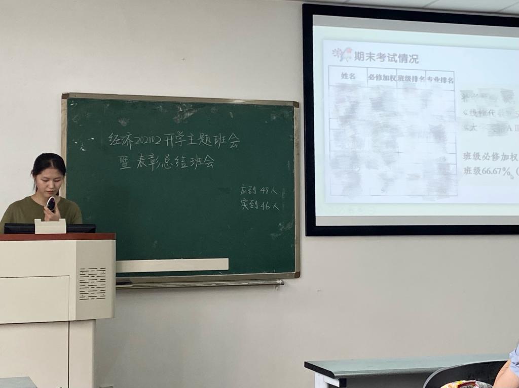 班会分为三项进程,分别是——学委汇报大一学年学习成绩情况,表彰奖励优秀同学,班主任总结发言。