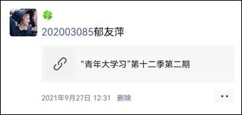 2.学习结束后应标记姓名、学号分享到朋友圈并保留朋友圈记录,以供后期评优评奖参考。如下图:
