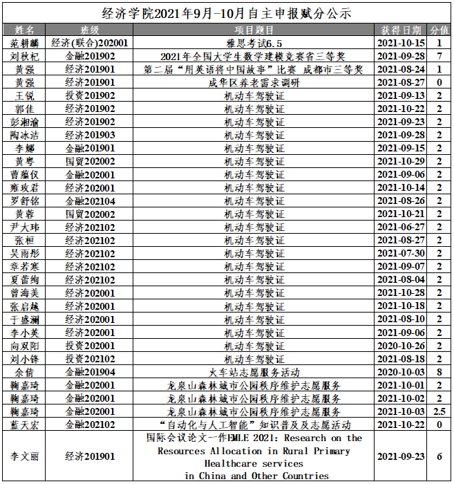 经学院团委二课运营中心收集自主申报材料,各相应职能部门审核,现将2021年9月-10月自主申报赋分情况公示如下:
