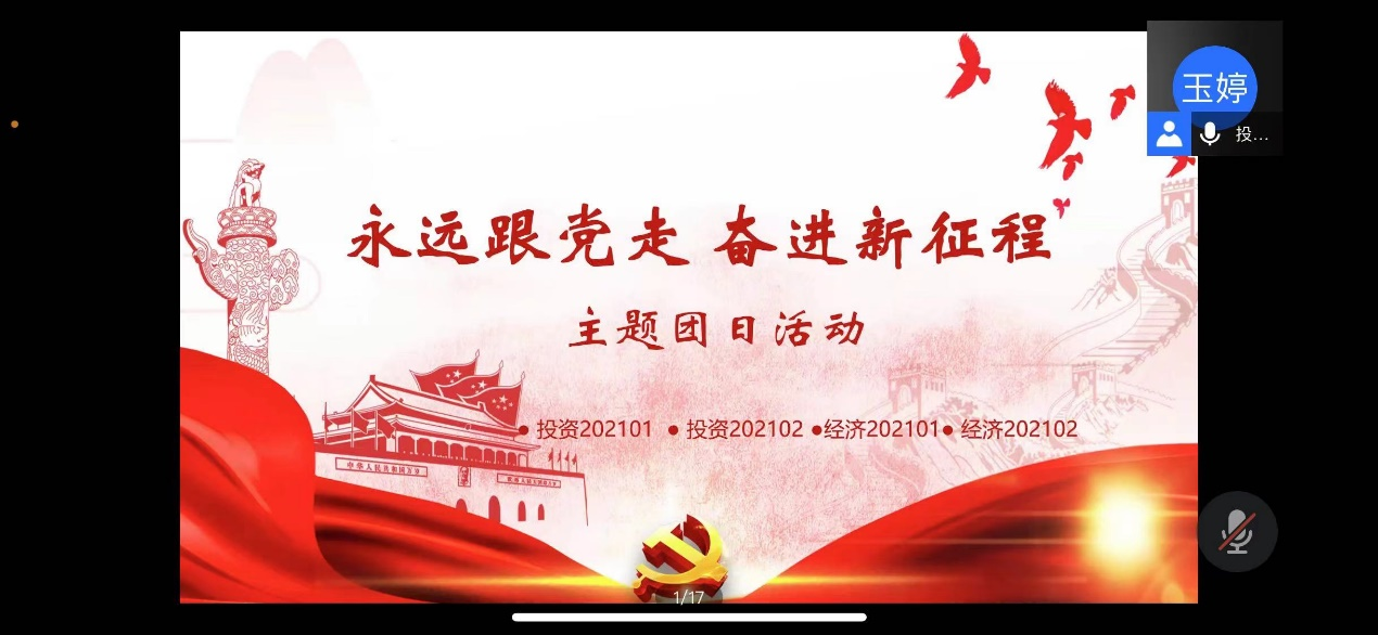 为持续深化党的百年奋斗重大成就和历史经验学习教育,引导青少年深刻感悟新时代党和国家事业发展的伟大成就,经济2101、2102团支部同投资2101、2102团支部为响应学院号召,以庆祝建团百年为契机,于4月22日晚开展“永远跟党走,奋进新征程”线上主题团日活动。