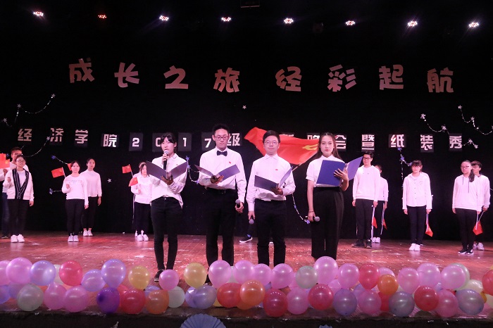 晚会分为《纯真年代》、《青涩蜕变》、《宁静致远》和《坚定信念》四个篇章,新老生以纸装秀比赛为载体同台献技,通过歌舞、小品、话剧、走秀、器乐等多种艺术形式表达着对成长之旅的美好憧憬和对新生入校的热烈欢迎。学院院长蒋远胜的欢迎辞情真意切,指明了大学四年成长成才的方向,表达了对新同学的殷切期望;话剧《地铁故事》以幽默的演绎批判了地铁里的不文明想象,弘扬了社会主义核心价值观中的公民基本道德规范;情景剧和诗朗诵《歌颂党恩》再现了中国共产党从嘉兴南湖的一艘小船出发到掌舵中国巨轮所历经的苦难与辉煌,表达了同学对十九大胜利召开的喜悦之情。鲜艳党旗引领成长之路,嘹亮歌声唱响青春旋律,多彩纸装秀出经济风采。