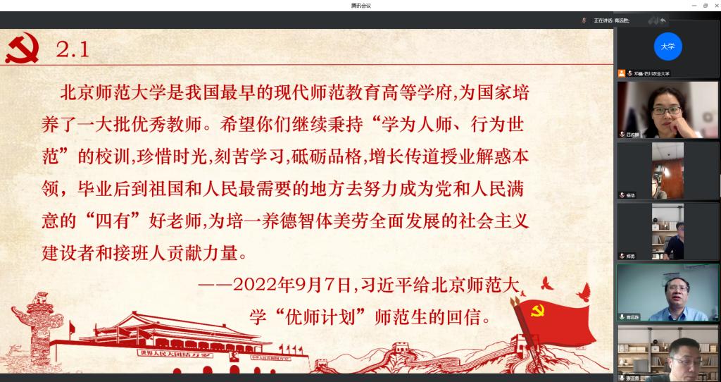 蒋远胜为大家讲授以“学悟总书记对教师寄语,努力做学生成长的引导者”为主题的微党课,提出身为教师首先要品德高尚,以德示范,同时作为传道受业解惑者,不仅要专业精湛,还必须精通经书。随后,曹正勇带领大家一起学习了习近平总书记来川视察重要指示精神和党的十八大以来习近平总书记对广大教师群体的寄语精神。