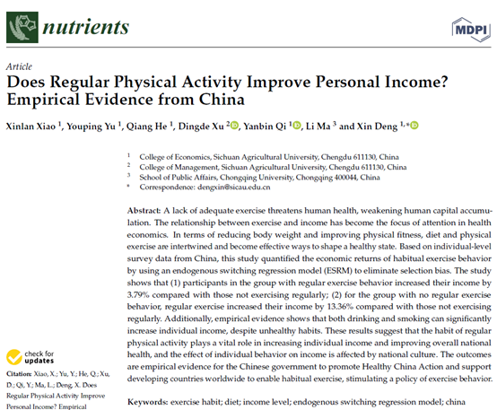 经济学专业2019级本科生肖芯兰为第一作者,题为“Does Regular Physical Activity Improve Personal Income? Empirical Evidence from China”的研究论文发表于国际权威期刊《Nutrients》(中科院TOP期刊,IF = 6.706,JCR排名15/90),量化了健康行为的效应表现。缺乏足够的锻炼威胁着人类健康,削弱了人力资本积累。基于来自全国的个体层面调查数据,采用内生转换回归模型消除选择偏差,量化了习惯性锻炼行为的经济回报。研究表明定期锻炼行为有助于提高个人收入水平。