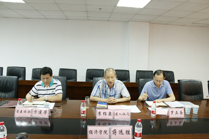 2017年6月28日下午,四川省人力资源和社会保障厅副巡视员李绍泉一行来我校beat365官方网站调研和座谈,并就城乡基本医疗保险整合等问题与beat365官方网站蒋远胜教授课题组展开深入的探讨和交流。省人社厅医保处副调研员罗正奎、省医保局综合室副主任方建荣随行前来。座谈会由蒋远胜教授主持。
