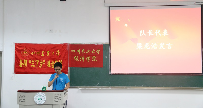仪式在一段回顾2016年暑期社会实践精彩瞬间的视频中拉开帷幕,成都市温江区大学生基层村官挂职锻炼团队队长梁龙浩作为实践团队队长代表发言,他庄重承诺在实践中要做到以下几点:第一,在社会实践活动中不断提高自身综合素质;第二,在社会实践活动中积极面向基层、服务新农村;第三,在社会实践中加强对学校、学院的宣传,不断扩大活动的社会影响力。