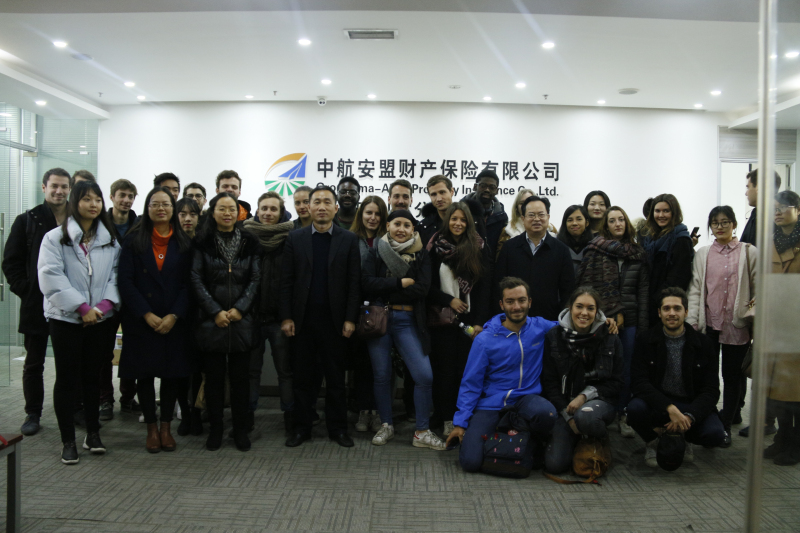 12月6日,beat365官方网站“中国商务拓展”项目的26名法国交换生在国贸系主任沈倩岭副教授的带领下赴学院实践基地——中航安盟财产保险有限公司和老外Here两家外资公司进行参观交流。