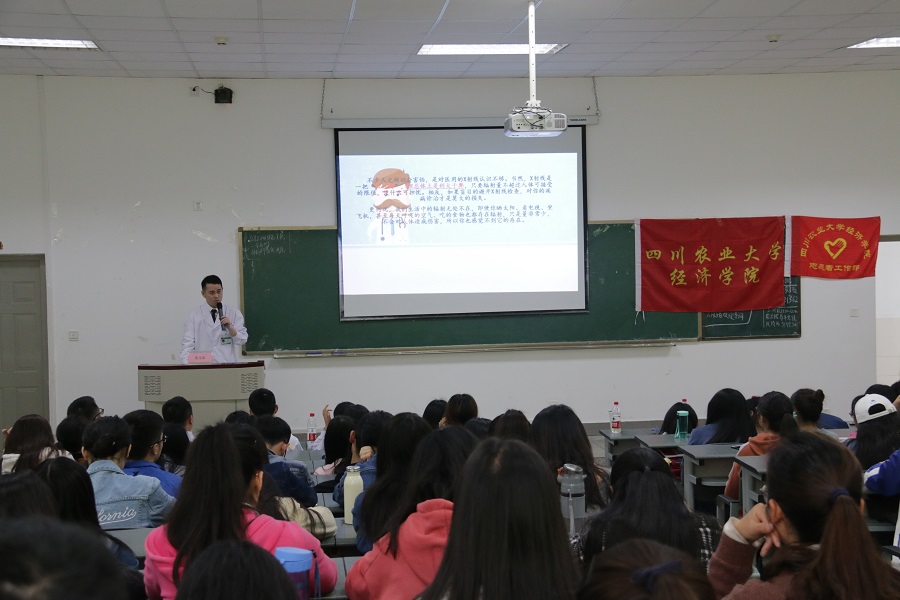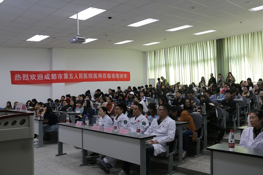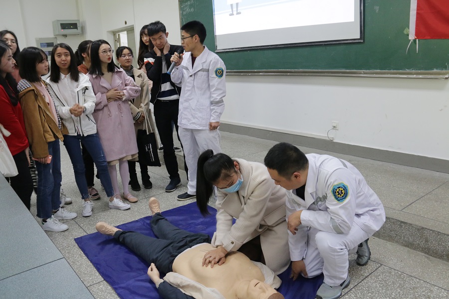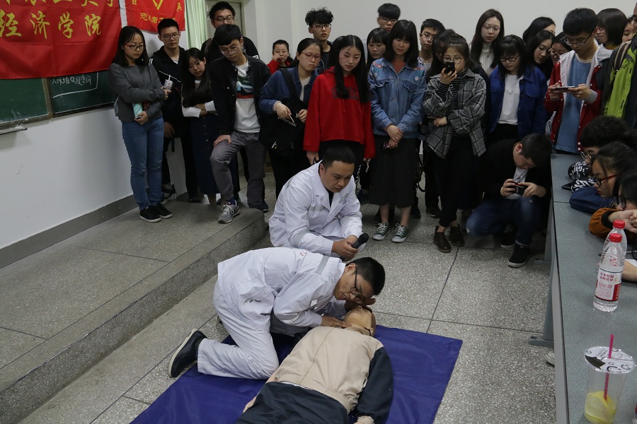 3月22日中午,成都市第五人民医院日间病房主治医师黄强、放射科医师龙义添、急救科专科护士杨涛一行12名医护人员为我校beat365官方网站师生进行校运会应急救护知识培训。经济学第39届校运会筹委会、全体参训的教练、运动员和后勤医护人员200余人聆听了培训。