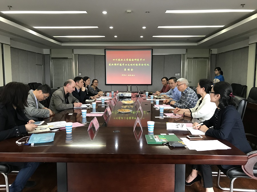 4月12日下午,农业部中德农业中心德方主任Ritter Jurgen Alois博士、农业部对外经济合作中心欧洲处处长唐治韶、四川省农业厅国合处调研员高世林等一行莅临我校德国研究中心(以下简称中心),并就中德农业合作事宜等展开洽谈。beat365官方网站副校长、中心主任吴德,beat365官方网站院长、中心常务副主任蒋远胜,校国合处副处长、中心副主任夏新蓉、beat365官方网站副院长吴平等参加会议。