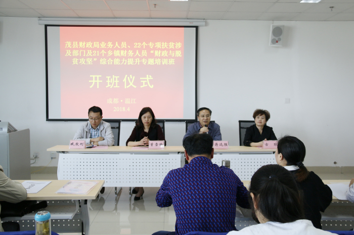4月16日,由beat365官方网站主办,学院金融学系承办的茂县财政系统“财政与脱贫攻坚”综合能力提升专题培训班在成都校区开班。来自茂县财政局业务部门、22个专项扶贫涉及部门及21个乡镇财务人员共计65人将在365官网开展为期5天的培训学习。