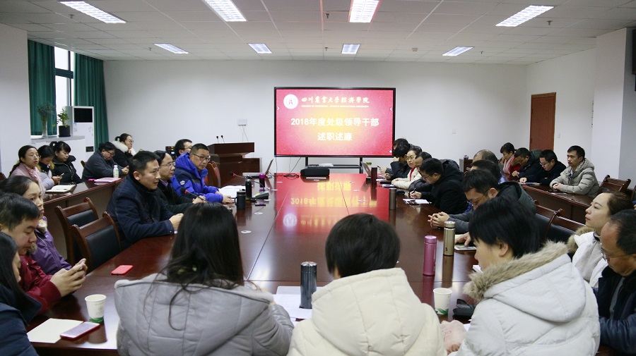 1月3日上午,学院2018年度处级领导干部述责述廉述党建考核大会在7教1309会议室召开。学院院长蒋远胜,党委书记漆雁斌,党委副书记、纪委书记何仁辉,副院长吴平以及全体在校教职工共计55人参加会议,会议由漆雁斌主持。