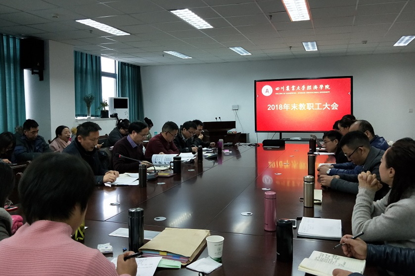 1月3日上午,学院2018年末教职工大会在7教1309会议室召开,总结回顾本年度工作,分析学院发展面临的新挑战,凝聚共识,振奋精神,统筹部署近期工作。学院院长蒋远胜,党委书记漆雁斌,党委副书记、纪委书记何仁辉,副院长吴平与学院全体在校教职工参加了会议,会议由漆雁斌主持。