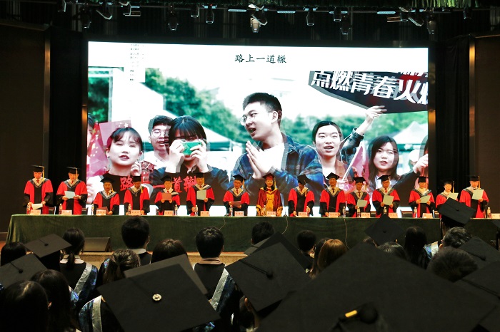 典礼开始前,大屏幕上播放了为毕业生们精心制作的回顾大学生活的电子相册。毕业生们以各自的精彩,创造了属于自己的不平凡,引起现场观众的共鸣。从军训、新生运动会、纸装秀新生晚会,再到主题班会、团日活动、美寝大赛等大大小小的活动,彼时再平常不过的点滴,在此刻看来却如此珍贵美好。看着大学生活被用心记录下来,毕业生们热情鼓掌,看到逗趣之处爆发出一阵欢笑,看到动情之处低头悄悄拭去泪水。