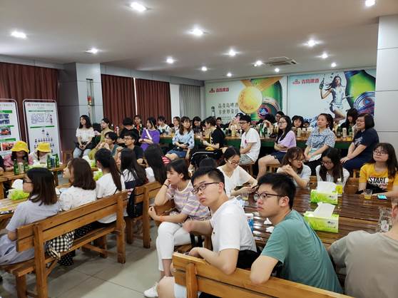 首先,青岛啤酒成都有限公司的徐经理安排相关专业人员带领同学们对整个企业的生产工艺流程进行现场参观并进行耐心讲解。先后来到了蒸煮室、发酵室、糖化室和灌装车间等。当同学们看到一瓶瓶啤酒从进口流水线中输送出来时兴奋不已,同时也建立起书本上的轻松的机器和厂房文字的描述与实际的闷热的生产环境的联系。