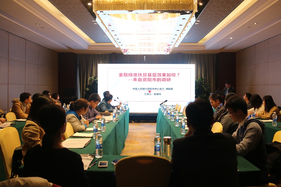 中国人民银行资阳市中心支行报告人赵健兵抛出“金融精准扶贫基层效果如何"这一问题,进而分享了他们在资阳市关于农村精准扶贫的调研。报告人围绕利用金融在农村进行精准扶贫的初始条件、发展空间和优势、现行效果以及存在的缺陷这四个方面进行阐述。通过数据分析与实践效果得出利用金融在农村发展中具有独特优势。来自西南大学的教授针对基层扶贫过程中“如何建立健全信贷风险补偿基金和补偿制度、发生损失后商业银行承担风险的比例怎样划分”这两个问题提问并现场与报告人赵建兵进行探讨。