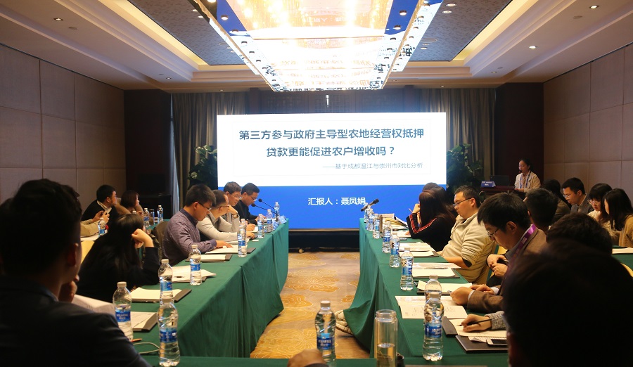 我校聂凤娟围绕"第三方参与政府主导性农地经营权抵押贷款是否更能促进农户增收。”这一问题进行研究结果阐述。在报告中,通过对成都温江与崇州市农地经营权抵押贷款现状,市场主导型与政府主导型模式运行结果进行分析,她强调单一的政府主导会存在比数少、施工源不广、活力低这一现象,论证了引入市场的必要性和必然性。在发展市场经济的背景下,提出"应当坚持第三方参与和政府主导农地经营权抵押贷款促进农户增收“这一结论。