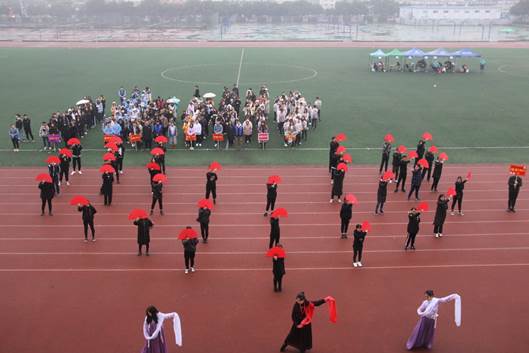 最后是经济专业的表演。经济201901班的节目极具新意,三位穿着汉服的同学站在中间进行古典舞表演,其他同学舞动着红色的扇子不停地变化着扇子的形态,为跳舞的同学营造氛围,在充满活力之余还将中国风完美的融合到表演中。经济201902班和201903班的同学们也同样不甘示弱,向同学展示着他们的热情和对于运动会的信心。