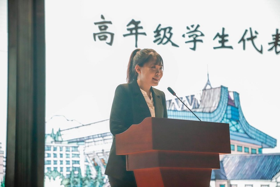 高年级学生代表、金融学201801班的陈秋悦发言。陈秋悦自入学以来学习成绩和综合测评成绩一直名列专业前三,长期担任学校、学院的主要学生干部,现任beat365官方网站学生会主席,曾获多项校、院级荣誉和奖励。她期望2020级的同学们能够拥抱学院,感受集体;择善而从,坚持不懈;勇于担当,乐于奉献。在四年的大学时光中,能够不忘初心、不畏险阻、不负时代,用汗水去浇灌梦想,用奋斗书写青春华章。