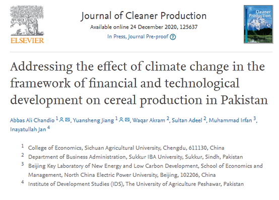 近日,365官网院长、“农村金融与发展”科研团队负责人蒋远胜教授与其指导的博士后Abbas Ali Chandio博士共同在国际前沿期刊《Journal of Cleaner Production》上发表题为“Addressing the effect of climate change in the framework of financial and technological development on cereal production in Pakistan”的论文。beat365官方网站beat365官方网站为第一通讯单位,蒋远胜教授与Abbas Ali Chandio博士为该论文的共同第一作者和通讯作者。根据JCR分区,《Journal of Cleaner Production》是绿色与可持续科学技术(GREEN & SUSTAINABLE SCIENCE & TECHNOLOGY)、工程与环境(ENGINEERING, ENVIRONMENT)、环境科学(ENVIRONMENTAL SCIENCES)多个领域的Q1区期刊,2019年的影响因子高达7.246。