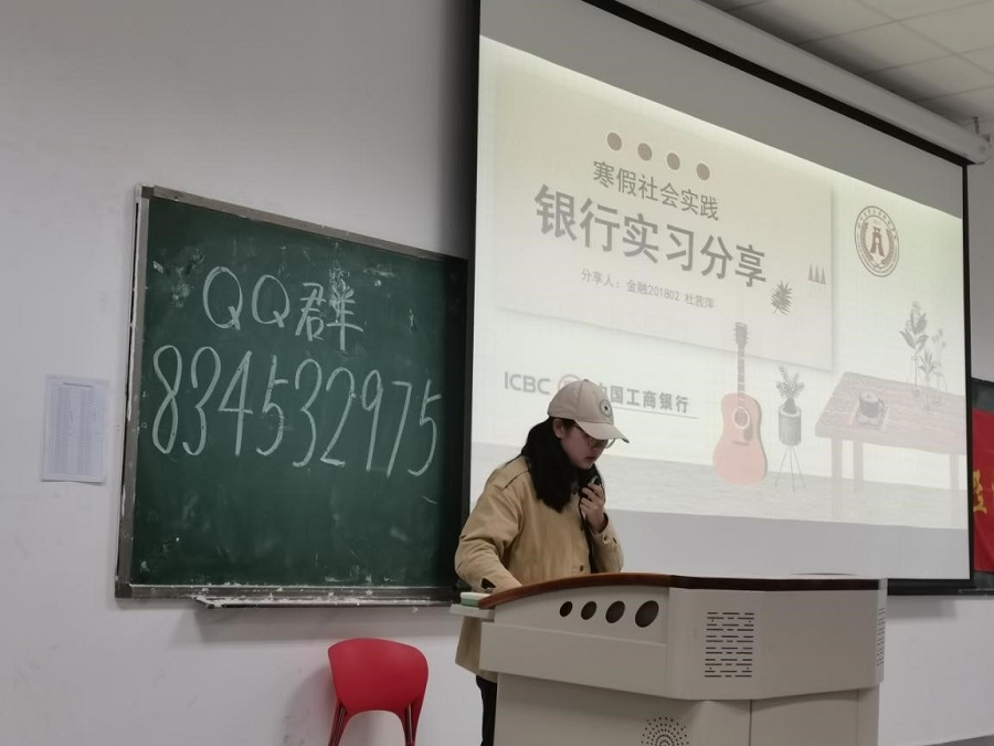分享会后是杜茜萍同学寒假在中国工商银行的实习经历分享。分享主要分为三部分,首先是前期准备部分,在这个部分,杜茜萍同学主要分享了她想要去银行实习的动机以及申请过程,让同学们认清了去实习的真正目的在于学习知识,培养能力,而不仅仅是为了挣二课分。接着便是中期实践部分,杜茜萍同学分享了在银行实习期间的工作,主要是配合工作人员完成健康码的扫描,帮助客户了解理财业务以及指导自动柜员机和智能终端业务的使用等。她强调到工作时一定要熟悉操作流程,用耐心细心诚心贴心的态度服务客户。在最后的后期感悟里,杜茜萍同学主要分享了自己在银行实习期间的所获所思,她认为本次实习带给她最大的收获就是学会了提高工作效率,锻炼了自己的能力。
