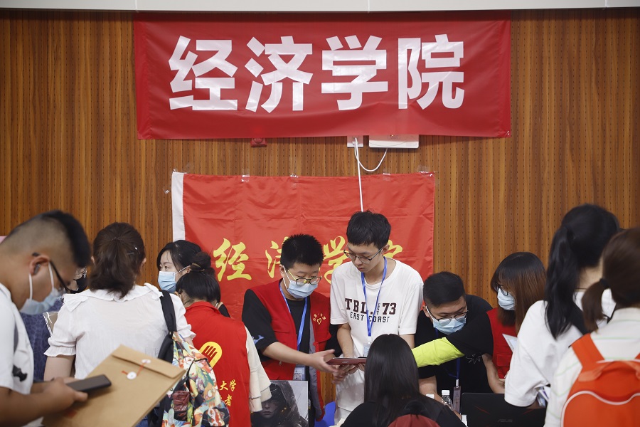 红色的工服代表着工作者们赤诚的寄望,迎新工作中处处都有忙碌的“红色”身影。7日,学院所有工作人员早早来到现场,统一换上红色工作服,井然有序地进行着新生的报道工作。迎新工作的开展也会面对各种突发事件,对此,学院未雨绸缪,为每一位新生定制了重要文件收纳袋,防止重要文件丢失,同时还准备了爱心伞、小扇子、喷壶等防雨防暑用品。迎新之时,志愿者们铆足了干劲,从行李寄存处奔赴新生寝室,从疫情报道点赶往迎新报道点,用汗水与热情诠释着经院人的团结与担当!在忙碌的身影背后,志愿者们更有着热切的关怀。他们热情地向新生介绍着学校的各项事宜,积极为新生描述出经院生活的美好图景,作引导,述流程,教经验,以身作则树立先锋模范作用,胸怀热情弘扬团结拼搏精神!