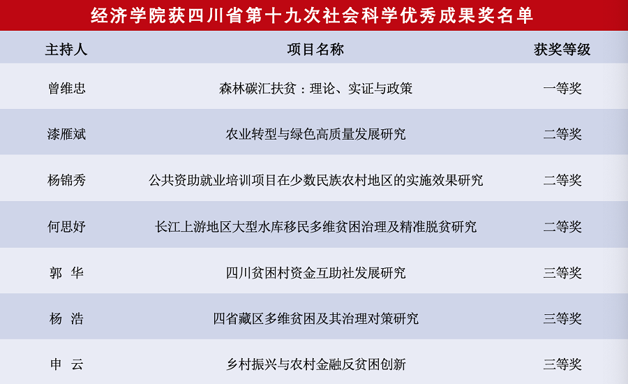 日前,《川观新闻》和四川省社科联官方网站公告了四川省第十九次社会科学优秀成果奖获奖名单,365官网共有主持的7项研究成果获奖,其中一等奖1项、二等奖3项、三等奖3项。由申云博士、徐斌博士、郭丽丽博士参与3项获二等获。获奖名单有:曾维忠教授、杨锦秀教授、漆雁斌教授、何思妤教授、郭华副教授、杨浩副教授、申云博士,详细获奖名单如下: