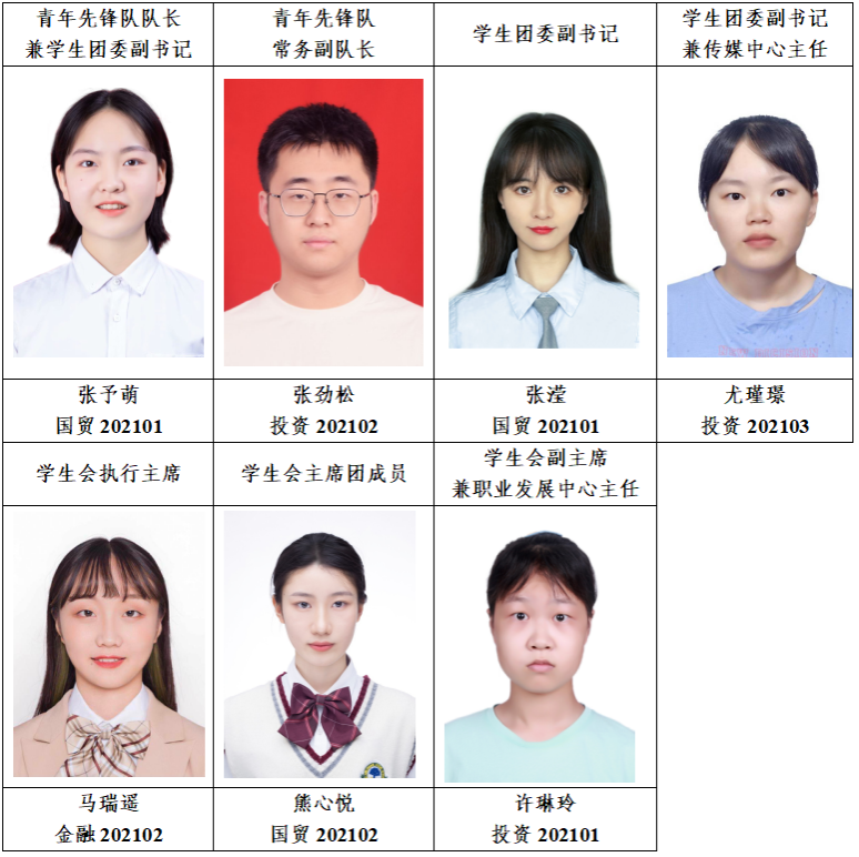 经个人申请,学院团委资格审查,储备期公示无异议,学代会选举以下同学为365官网第九届学生团体联合会主席团成员,试用期三个月,现公示如下: