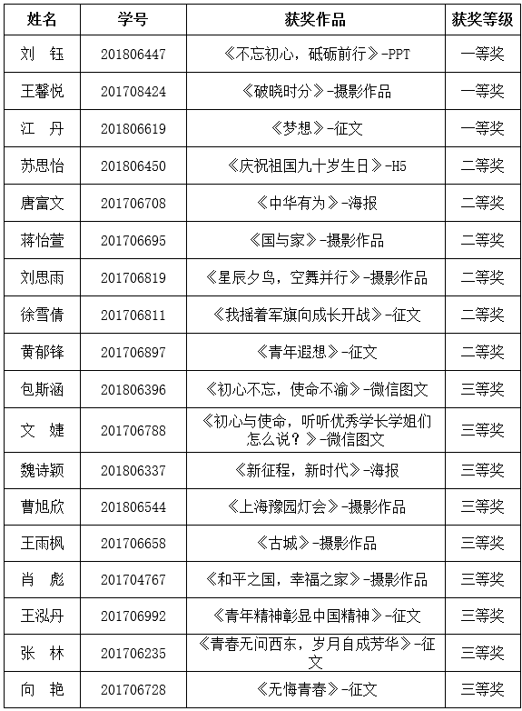 经各支部、小班、个人自愿申报,评委集中评选,并报学院团委评审,现将beat365官方网站“中国有梦,青年有为”喜迎建国70周年系列活动获奖名单公布如下: