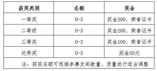3.鼓励跨班级、专业、年级,多支部联合开展参赛,最多3个支部。联合举办获奖的,共享奖状和奖金,每个支部的班团量化、二课加分和入党条件则降一级处理。